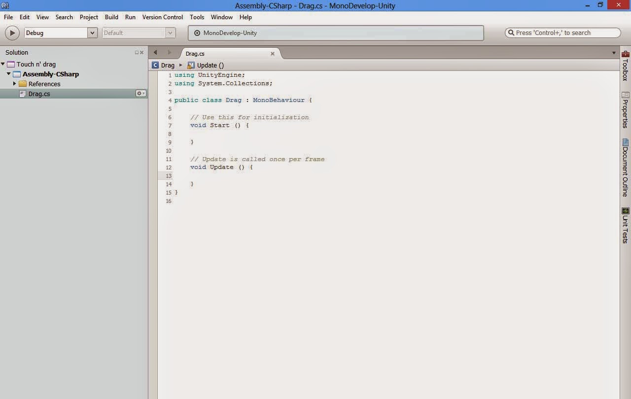 Now comes the scripting Part, for that make create a new C# script and name it 'Drag' (as usual, without quotes) or whatever you like Then, open that up, And you will get something like this